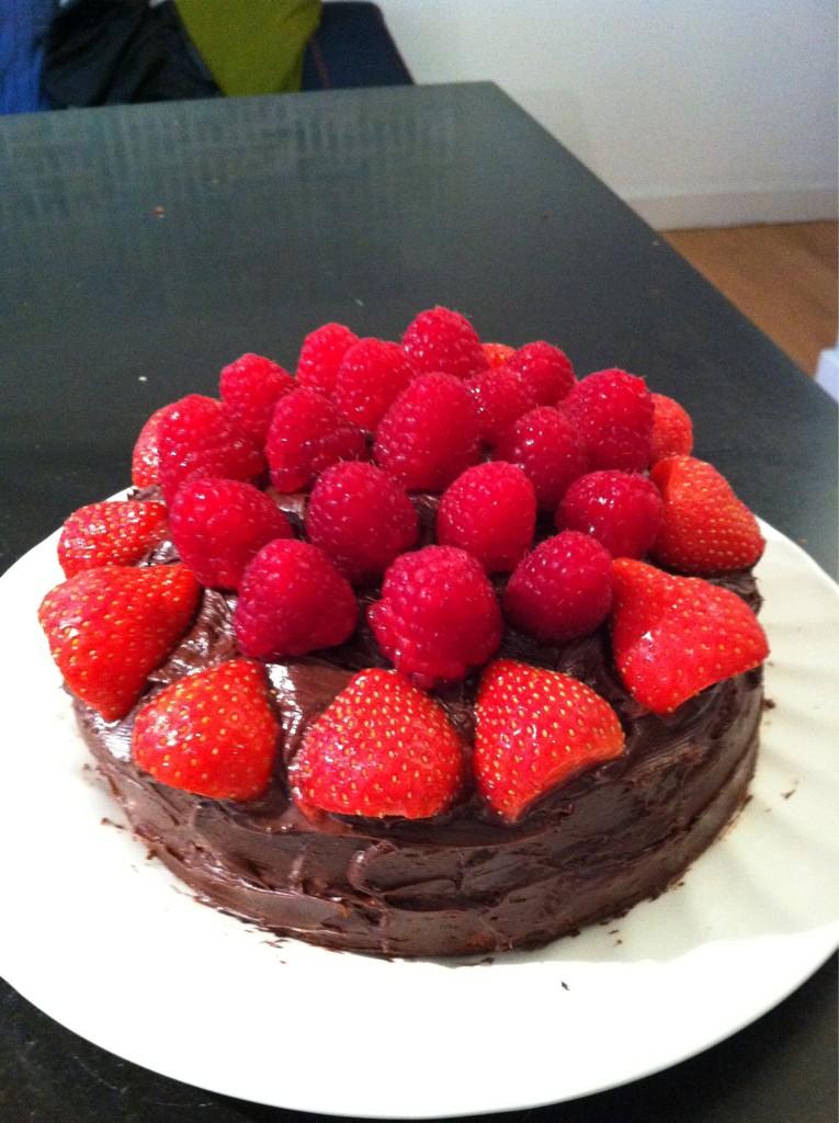 The previously-light cake weighed a tonne after I decorated it haha. At first I was like "Is this too many berries?" but then I was like "Nah, he loves berries.". I was just gonna write something on it in icing, but this should taste better (and I have terrible handwriting, so it probably looks a lot better this way, too).